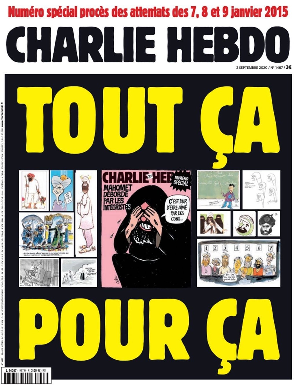 «صارت هذه الرسومات جزءًا من التاريخ، ولا يمكننا إعادة كتابة ما صار تاريخًا، كما لا يمكننا محوه. هذا ما حصل: كان نشر هذه الرسومات التي اعتبرها عدد من المسلمين ازدراء هو ما تسبب في مجزرة السابع من يناير كانون ثاني، والتي ارتكبها قتلة أرادوا «الانتقام للنبي» وهم يصرخون ذلك بعد أن فعلوا فعلتهم وهم ينصرفون من مقر شارلي إيبدو. فهذه الرسومات هي أدلة جنائية. لذا كان من الضروري بالنسبة لنا إعادة إنتاج هذه الكاريكاتورات في هذا الأسبوع إبان انطلاق محاكمة اعتداءات يناير كانون الثاني 2015 الإرهابية. كل الأسباب التي تعارضنا تتعلق حصرًا بالجبن السياسي والصحفي. هل نريد أن نعيش في بلد يفتخر بديمقراطية حرة عظيمة ويسمح في ذات الوقت أن يتخلى عن أعمق معتقداته؟ من جهتنا، فهذا غير مقبول أبدًا، إلا لو كان يعني الأمر العيش في بلد آخر، تحت نظام حكم آخر، وفي عالم آخر.
